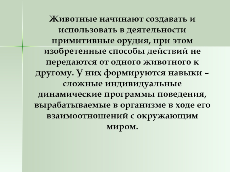 реагировать на каждое изменение, происходящее в ней, т.е. начинает вырабатывать индивидуально изменчивые формы поведения в отличие от растительного мира.