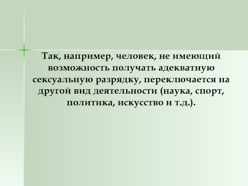 Слайд 141Так, например, человек, не имеющий возможность получать адекватную сексуальную разрядку,