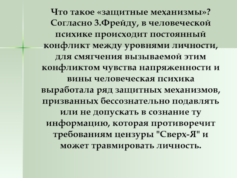 Слайд 120Что такое «защитные механизмы»? Согласно 3.Фрейду, в человеческой психике происходит