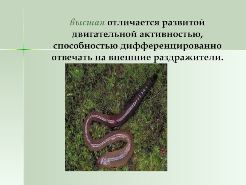 Слайд 46высшая отличается развитой двигательной активностью, способностью дифференцированно отвечать на внешние