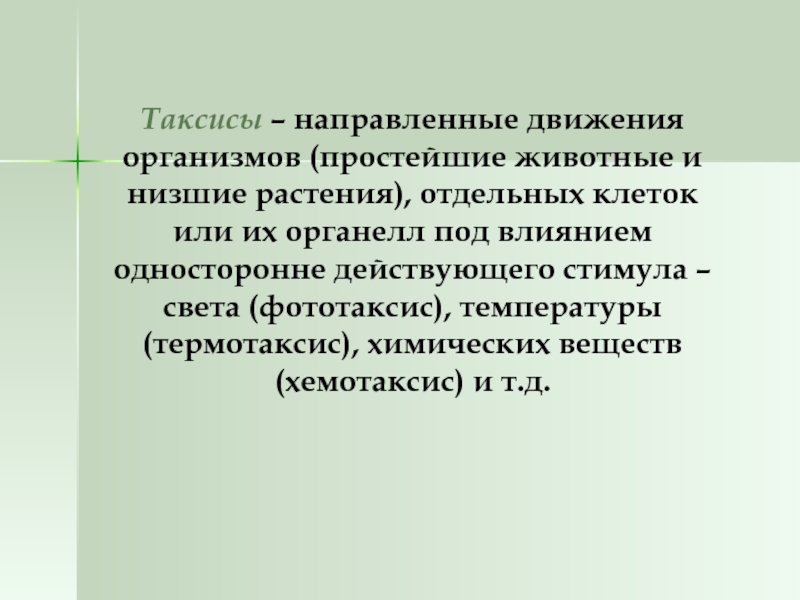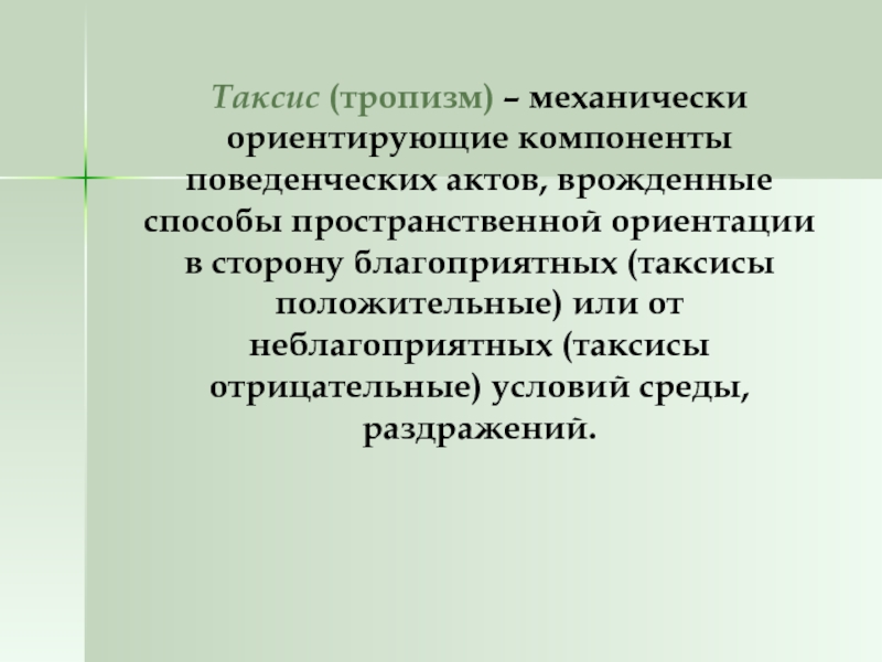 Слайд 33Таксис (тропизм) – механически ориентирующие компоненты поведенческих актов, врожденные способы