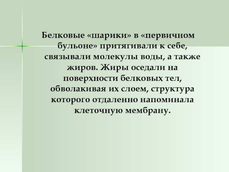 Слайд 11Белковые «шарики» в «первичном бульоне» притягивали к себе, связывали молекулы