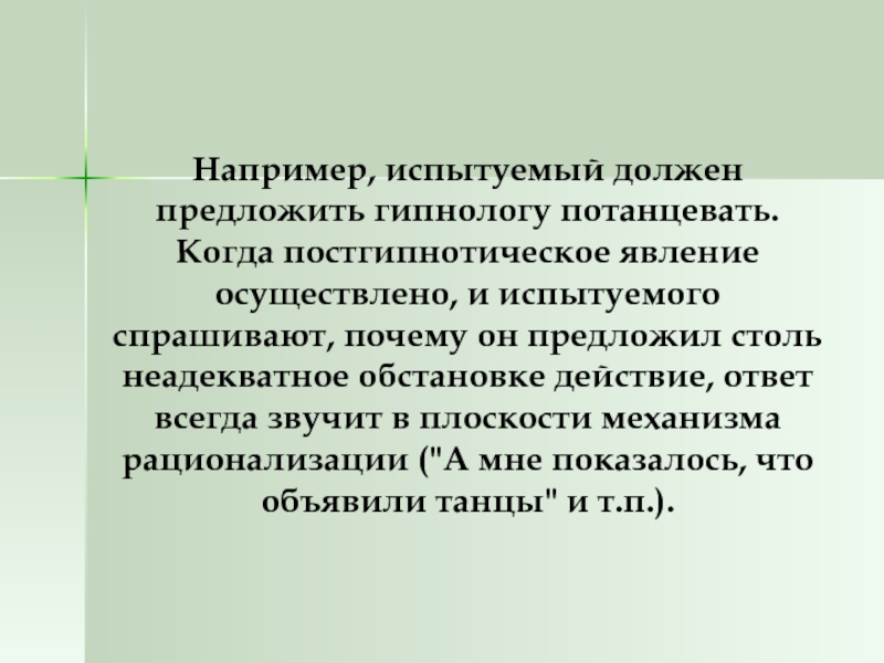 Например, испытуемый должен предложить гипнологу потанцевать. Когда постгипнотическое явление осуществлено,