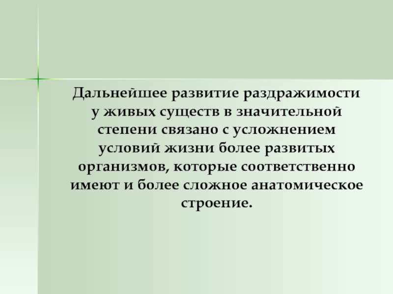 Слайд 36Дальнейшее развитие раздражимости у живых существ в значительной степени связано
