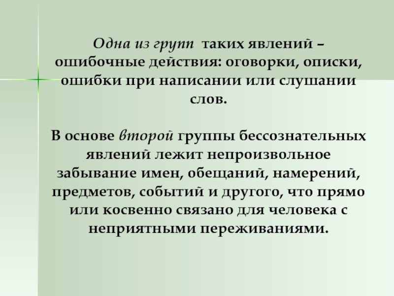 бессознательных явлений лежит непроизвольное забывание имен, обещаний, намерений, предметов, событий и другого, что прямо или косвенно связано для человека с неприятными переживаниями.