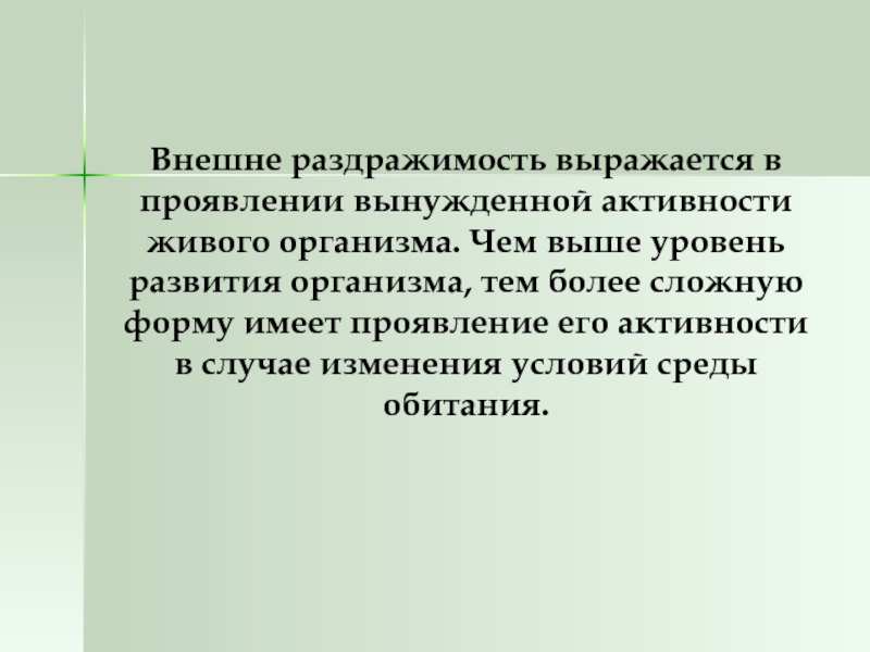 Слайд 32Внешне раздражимость выражается в проявлении вынужденной активности живого организма. Чем
