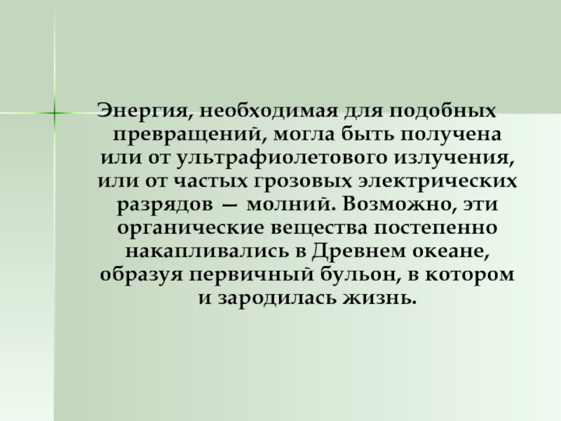 Возможно, эти органические вещества постепенно накапливались в Древнем океане, образуя первичный бульон, в котором и зародилась жизнь.