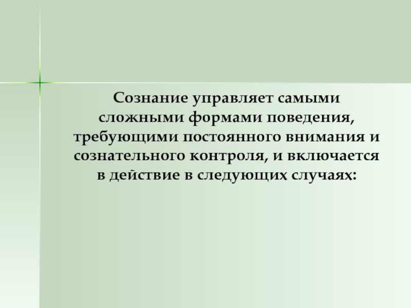 Слайд 111Сознание управляет самыми сложными формами поведения, требующими постоянного внимания и
