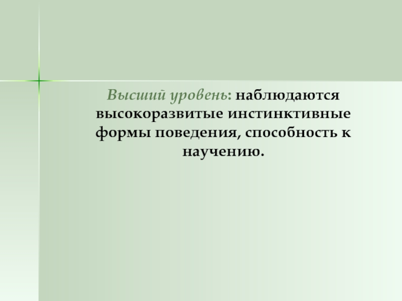 Слайд 48Высший уровень: наблюдаются высокоразвитые инстинктивные формы поведения, способность к научению.