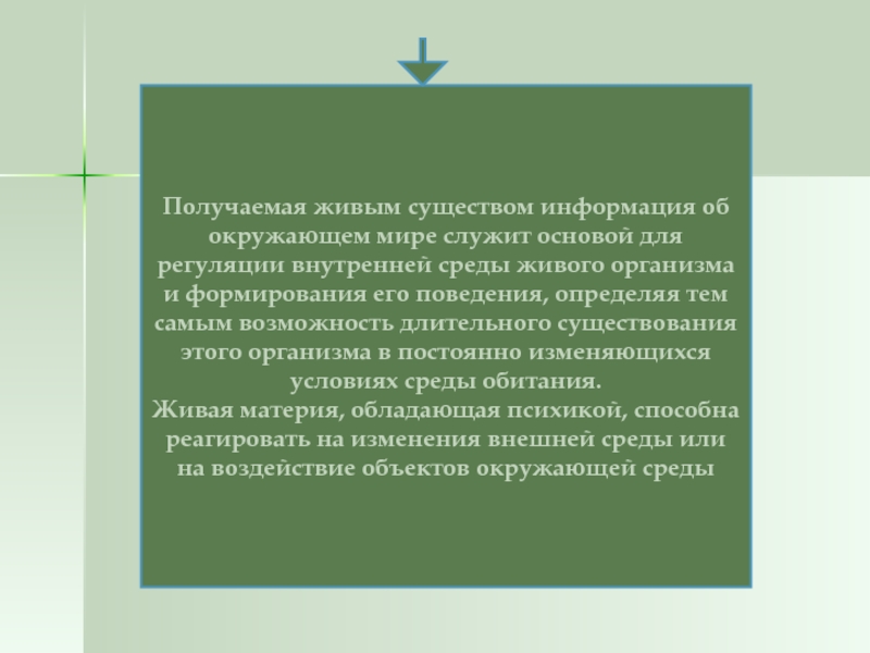 Слайд 28Получаемая живым существом информация об окружающем мире служит основой для