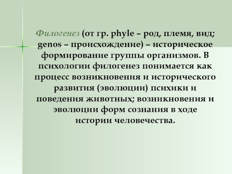происхождение) – историческое формирование группы организмов. В психологии филогенез понимается