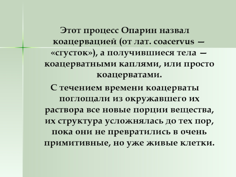 Слайд 12Этот процесс Опарин назвал коацервацией (от лат. соасеrvus — «сгусток»),