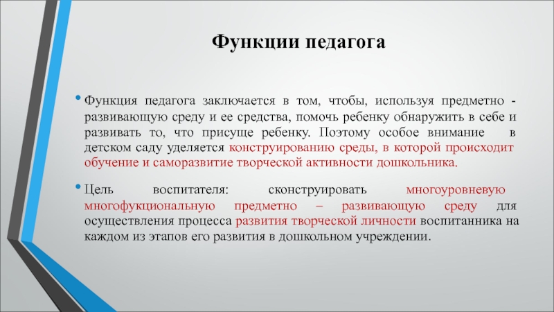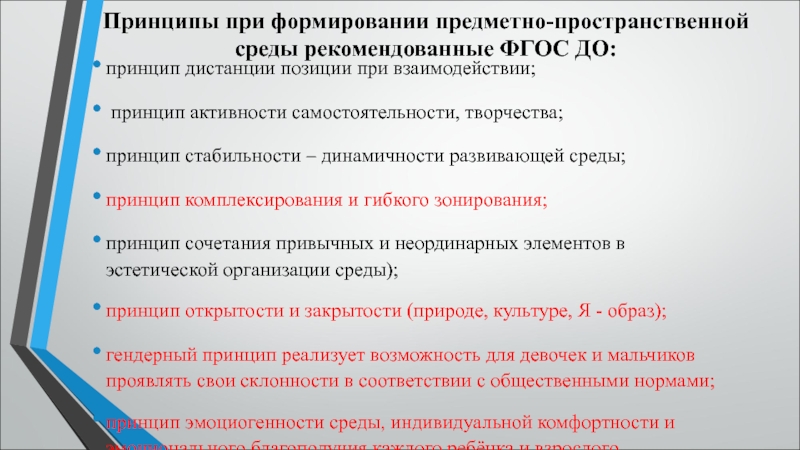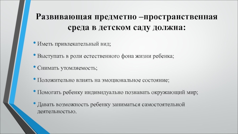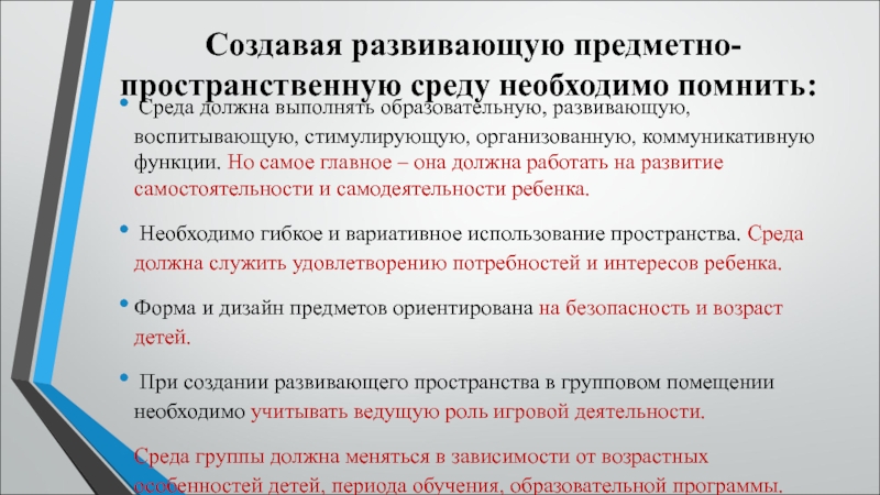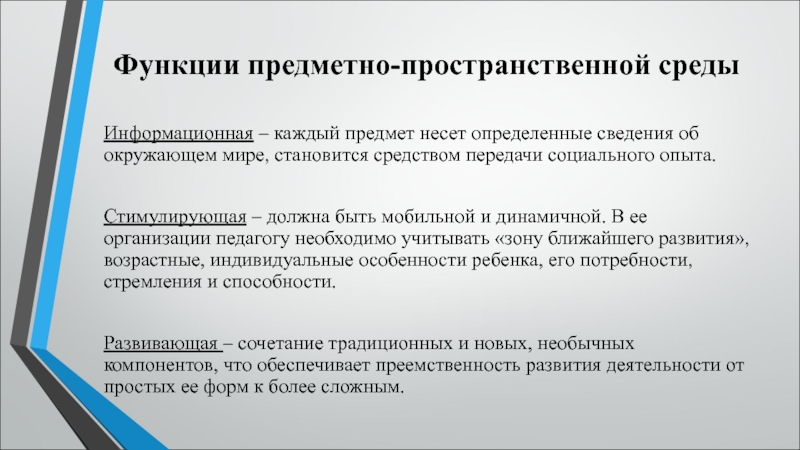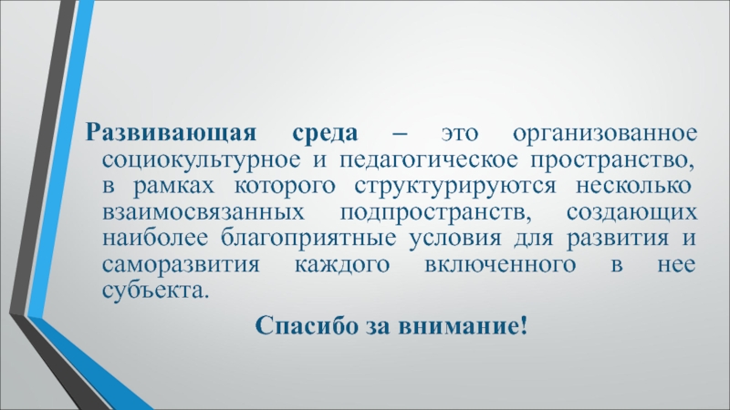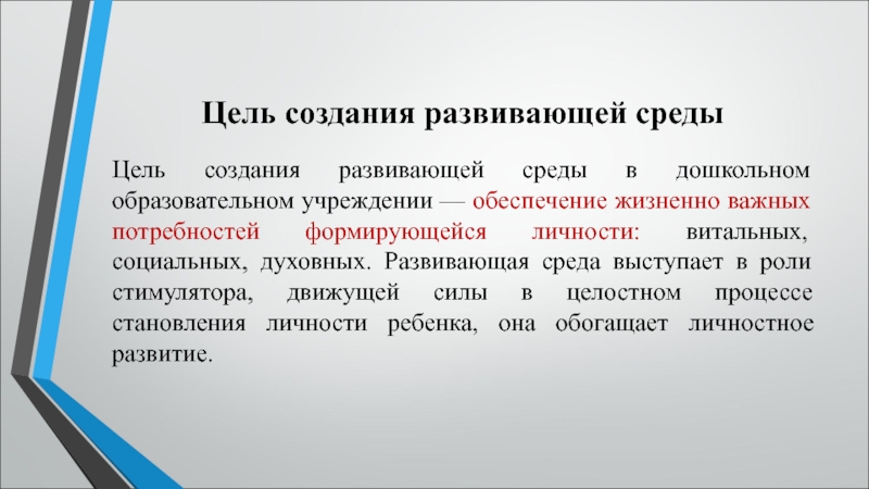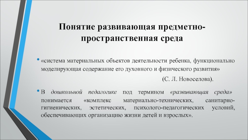 (С. Л. Новоселова).В дошкольной педагогике под термином «развивающая среда» понимается «комплекс материально-технических, санитарно-гигиенических, эстетических, психолого-педагогических условий, обеспечивающих организацию жизни детей и взрослых».