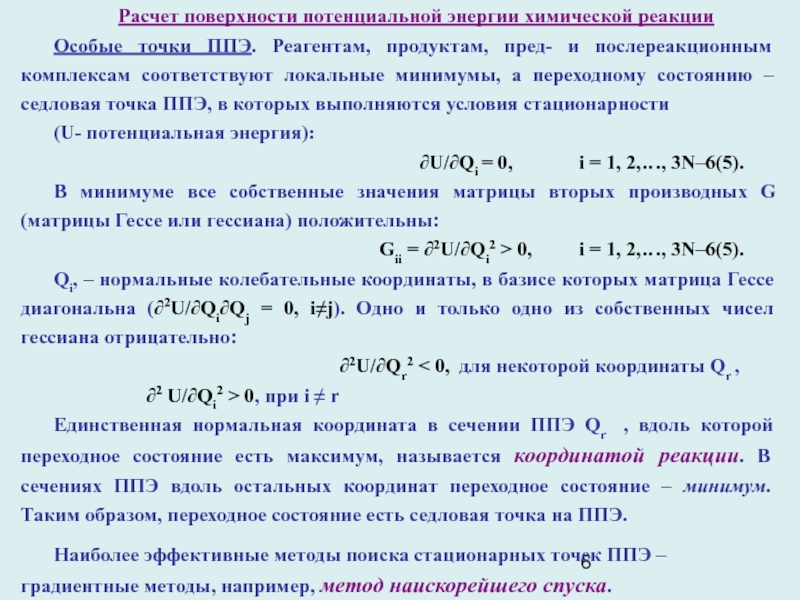 Единственная нормальная координата в сечении ППЭ Qr , вдоль которой переходное состояние есть максимум, называется координатой реакции. В сечениях ППЭ вдоль остальных координат переходное состояние – минимум. Таким образом, переходное состояние есть седловая точка на ППЭ.
