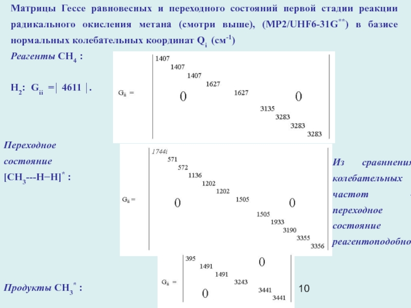 Слайд 10Матрицы Гессе равновесных и переходного состояний первой стадии реакции радикального