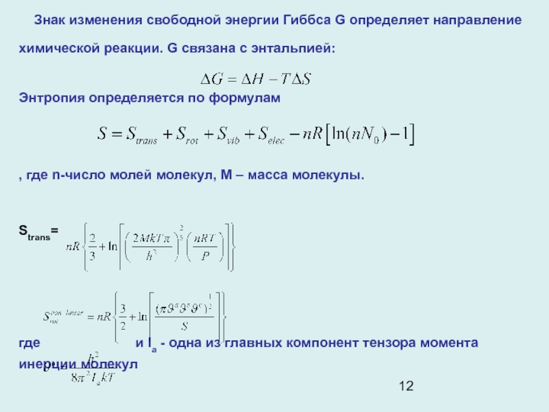 Слайд 12 Знак изменения свободной энергии Гиббса G определяет направление