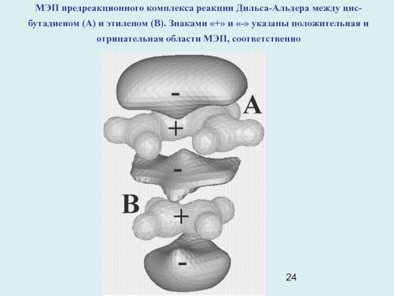 Слайд 24МЭП предреакционного комплекса реакции Дильса-Альдера между цис-бутадиеном (А) и этиленом