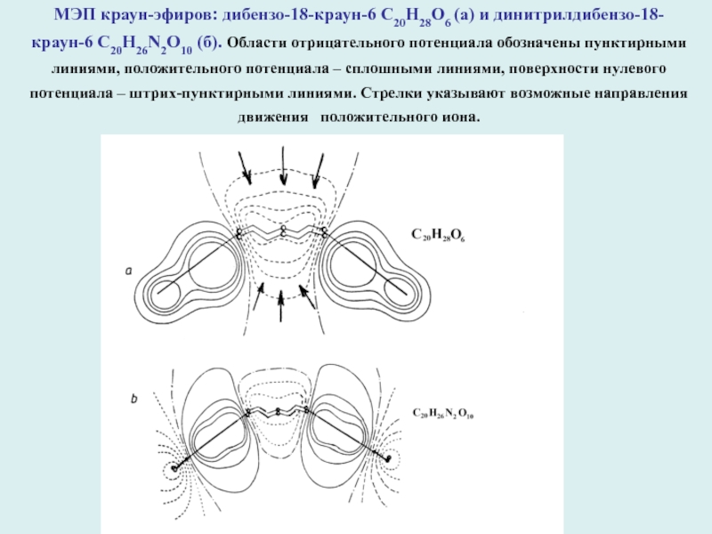 МЭП краун-эфиров: дибензо-18-краун-6 С20Н28О6 (а) и динитрилдибензо-18-краун-6 С20Н26N2О10 (б). Области