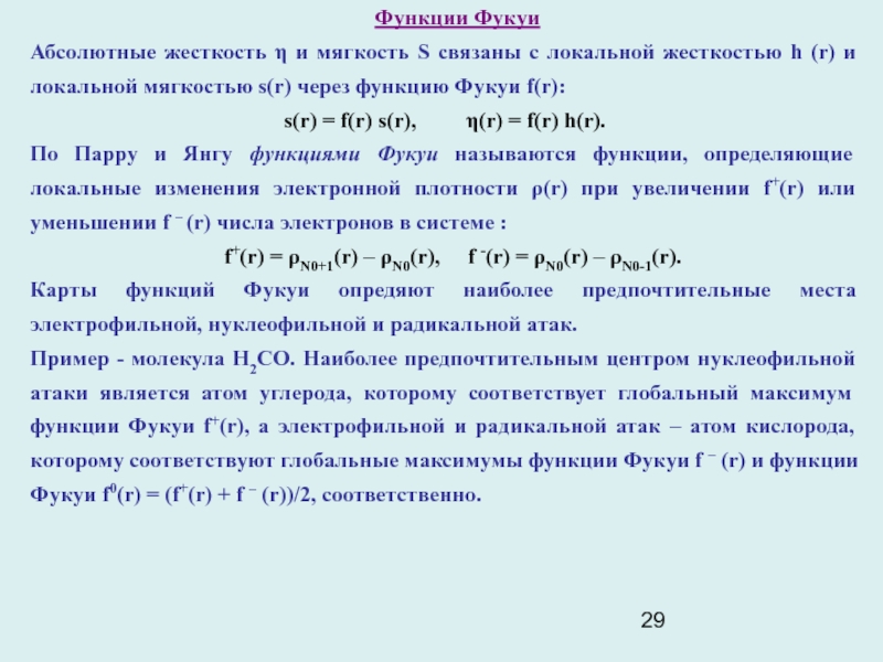 Пример - молекула Н2СО. Наиболее предпочтительным центром нуклеофильной атаки является атом углерода, которому соответствует глобальный максимум функции Фукуи f+(r), а электрофильной и радикальной атак – атом кислорода, которому соответствуют глобальные максимумы функции Фукуи f – (r) и функции Фукуи f0(r) = (f+(r) + f – (r))/2, соответственно.