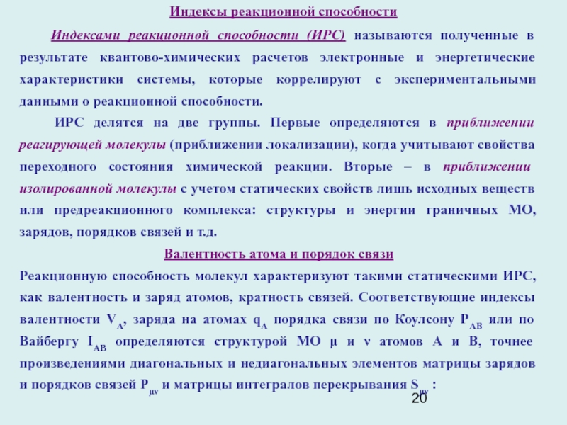 Реакционную способность молекул характеризуют такими статическими ИРС, как валентность и заряд атомов, кратность связей. Соответствующие индексы валентности VA, заряда на атомах qA порядка связи по Коулсону РAB или по Вайбергу IAB определяются структурой МО μ и ν атомов А и В, точнее произведениями диагональных и недиагональных элементов матрицы зарядов и порядков связей Рμν и матрицы интегралов перекрывания Sμν :