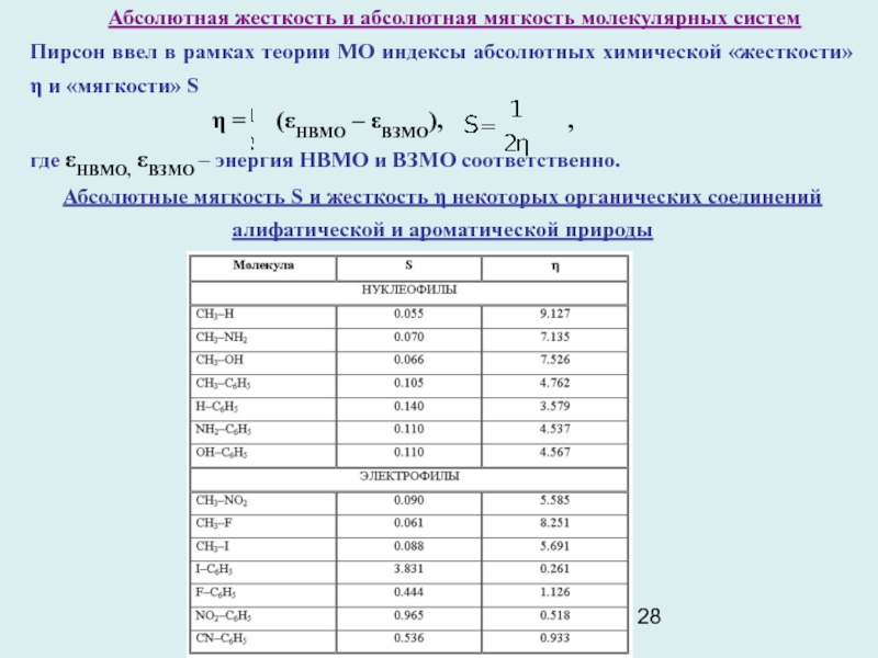 Слайд 28 Абсолютная жесткость и абсолютная мягкость молекулярных систем