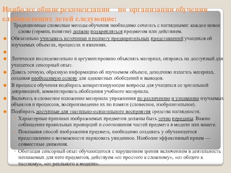 Слайд 11Наиболее общие рекомендации по организации обучения слабовидящих детей следующие: