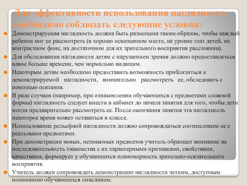 Слайд 10Для эффективности использования наглядности необходимо соблюдать следующие условия: