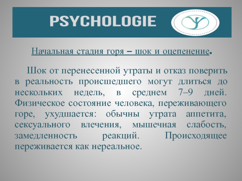 недель, в среднем 7–9 дней. Физическое состояние человека, переживающего горе, ухудшается: обычны утрата аппетита, сексуального влечения, мышечная слабость, замедленность реакций. Происходящее переживается как нереальное.