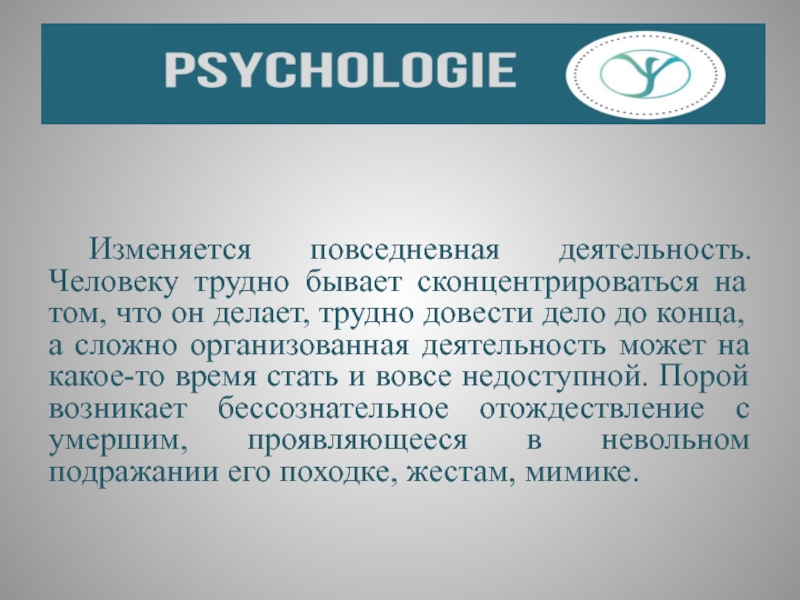деятельность может на какое-то время стать и вовсе недоступной. Порой возникает бессознательное отождествление с умершим, проявляющееся в невольном подражании его походке, жестам, мимике.