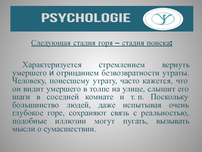 Слайд 34Следующая стадия горя – стадия поиска: