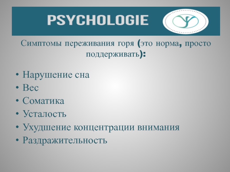 Слайд 20Симптомы переживания горя (это норма, просто поддерживать):