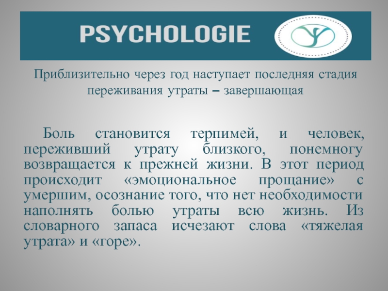 Слайд 48Приблизительно через год наступает последняя стадия переживания утраты – завершающая