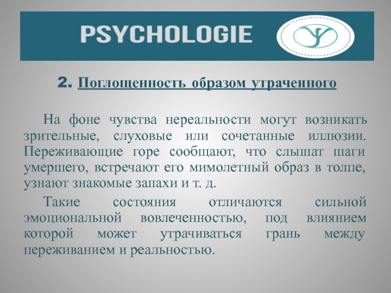 видит умершего в толпе на улице, слышит его шаги в соседней комнате и т. п. Поскольку большинство людей, даже испытывая очень глубокое горе, сохраняют связь с реальностью, подобные иллюзии могут пугать, вызывать мысли о сумасшествии.