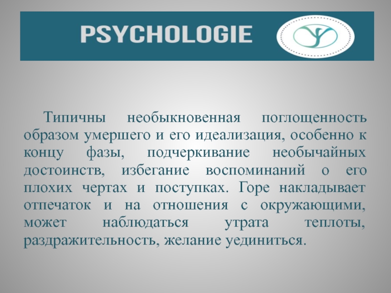 Слайд 40 Типичны необыкновенная поглощенность образом умершего и его идеализация, особенно к