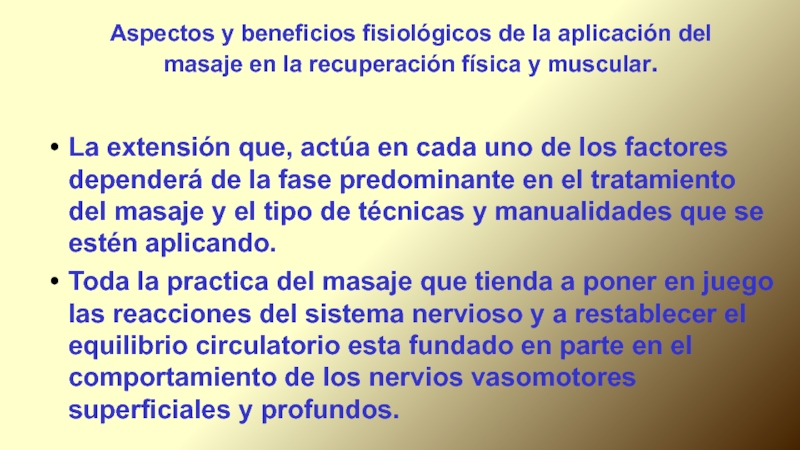 Слайд 43Aspectos y beneficios fisiológicos de la aplicación del masaje en