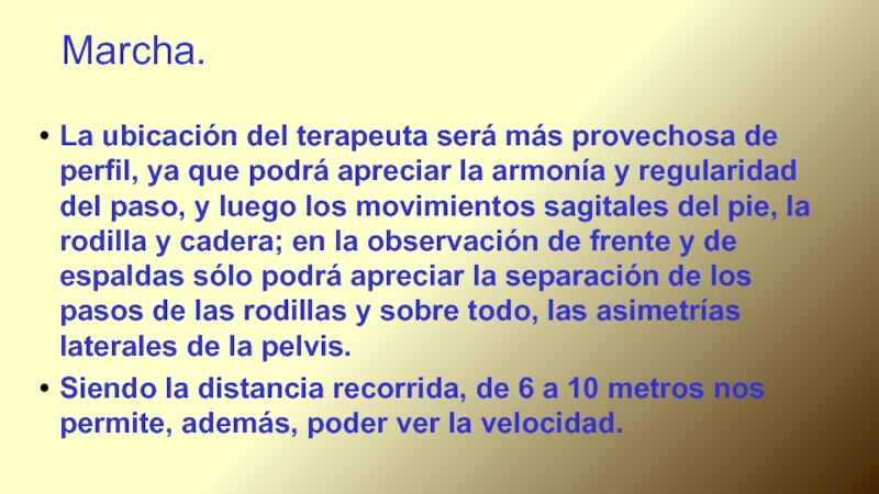 Se observara la velocidad de la marcha, al ritmo propio del paciente y luego con variaciones, por ejemplo;