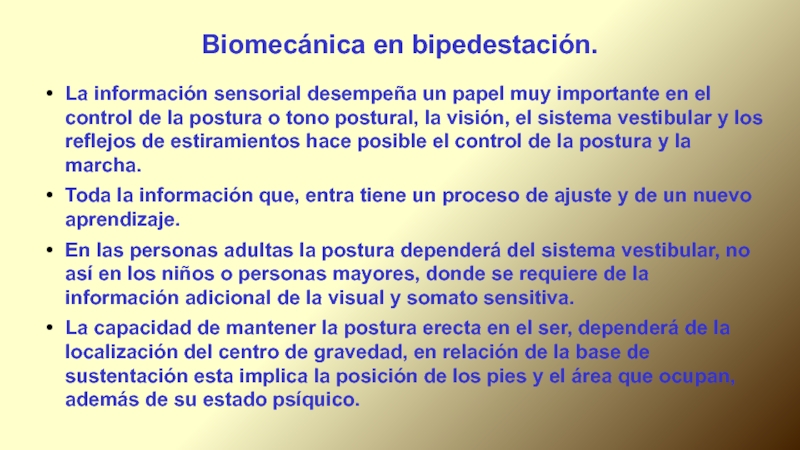 En las personas adultas la postura dependerá del sistema vestibular, no así en los niños o personas mayores, donde se requiere de la información adicional de la visual y somato sensitiva.