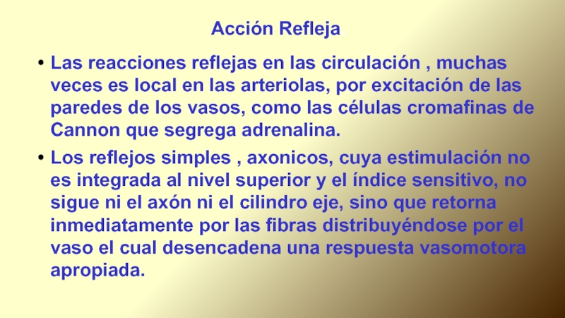 Los reflejos simples , axonicos, cuya estimulación no es integrada al nivel superior y el índice sensitivo, no sigue ni el axón ni el cilindro eje, sino que retorna inmediatamente por las fibras distribuyéndose por el vaso el cual desencadena una respuesta vasomotora apropiada.