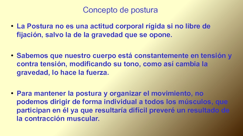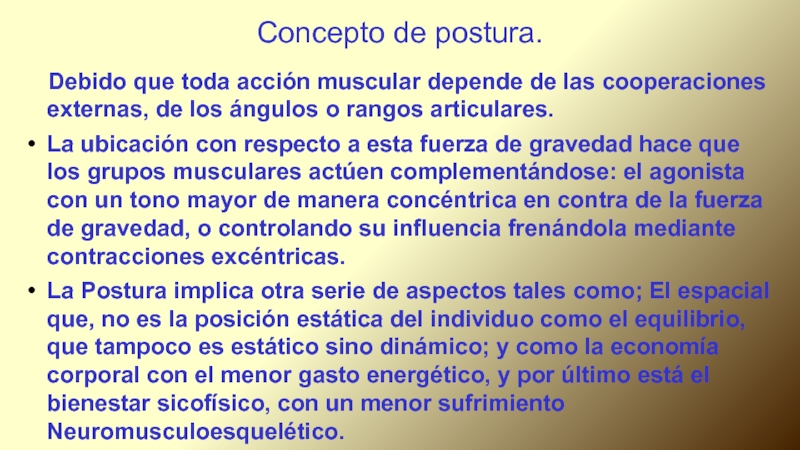 La Postura implica otra serie de aspectos tales como; El espacial que, no es la posición estática del individuo como el equilibrio, que tampoco es estático sino dinámico; y como la economía corporal con el menor gasto energético, y por último está el bienestar sicofísico, con un menor sufrimiento Neuromusculoesquelético.