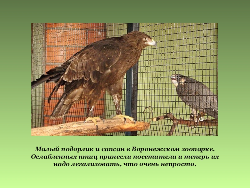 Слайд 17Малый подорлик и сапсан в Воронежском зоопарке. Ослабленных птиц принесли