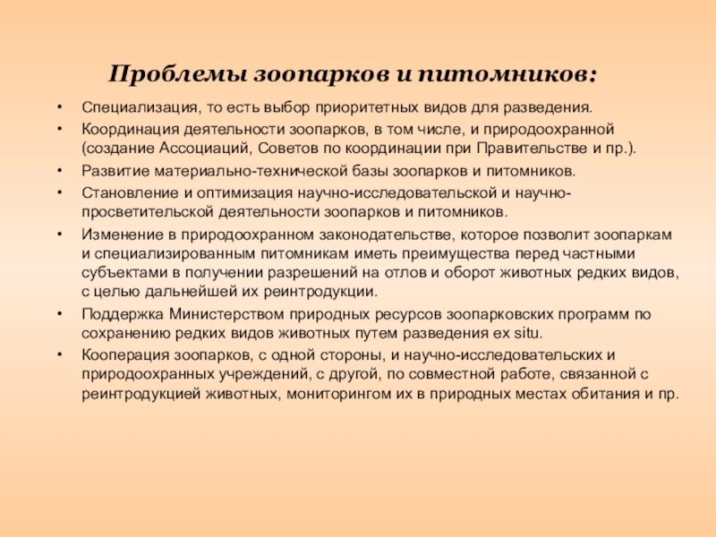 Становление и оптимизация научно-исследовательской и научно-просветительской деятельности зоопарков и питомников.