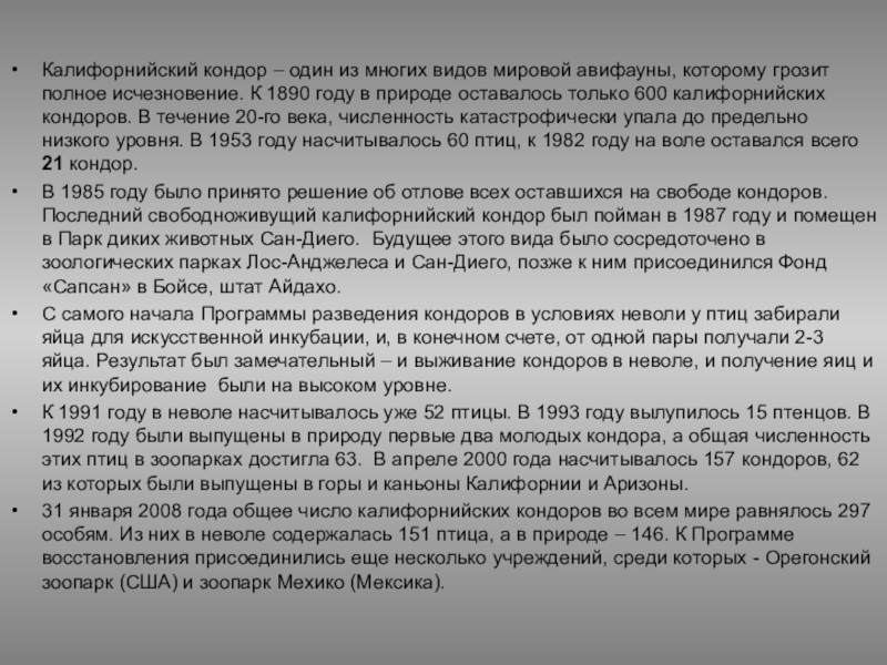600 калифорнийских кондоров. В течение 20-го века, численность катастрофически упала до предельно низкого уровня. В 1953 году насчитывалось 60 птиц, к 1982 году на воле оставался всего 21 кондор.