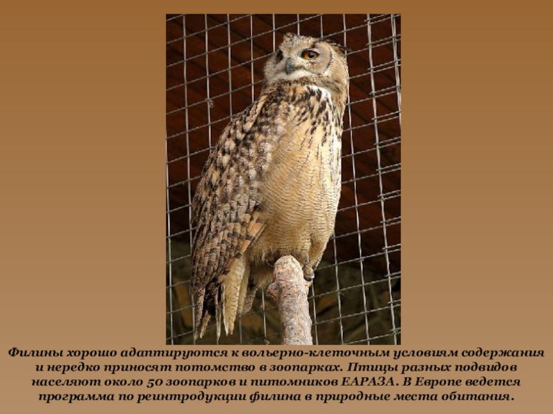 Слайд 18Филины хорошо адаптируются к вольерно-клеточным условиям содержания и нередко приносят