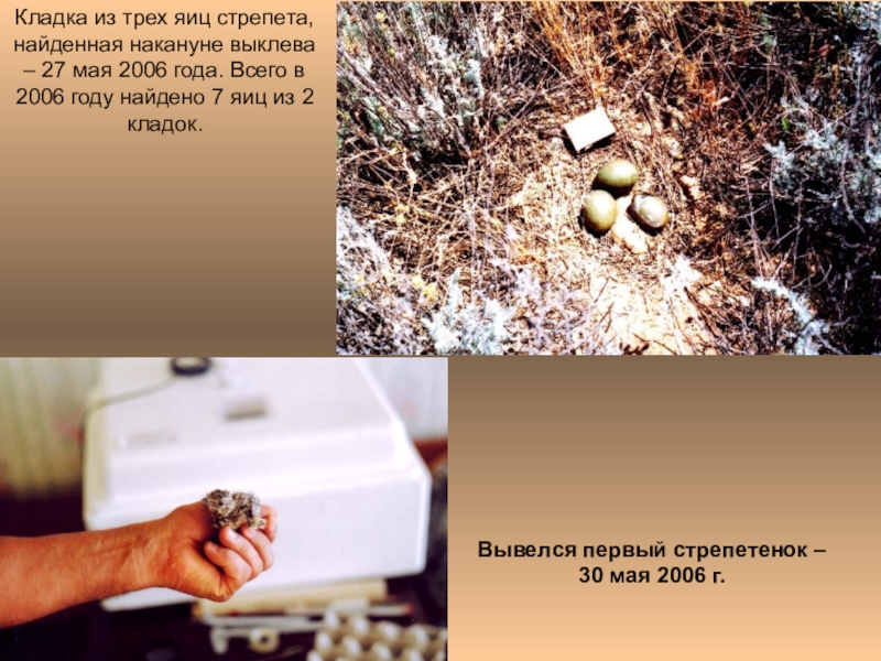 Слайд 27Кладка из трех яиц стрепета, найденная накануне выклева – 27