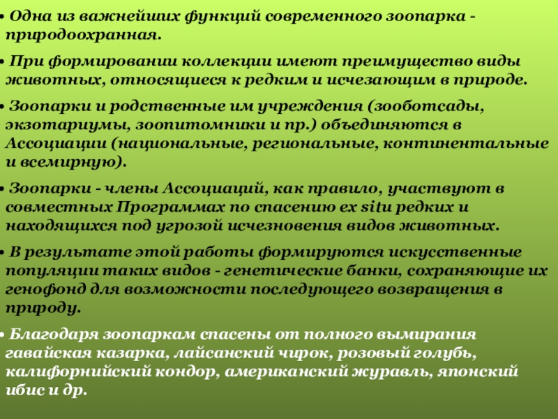 Слайд 2 Одна из важнейших функций современного зоопарка - природоохранная.