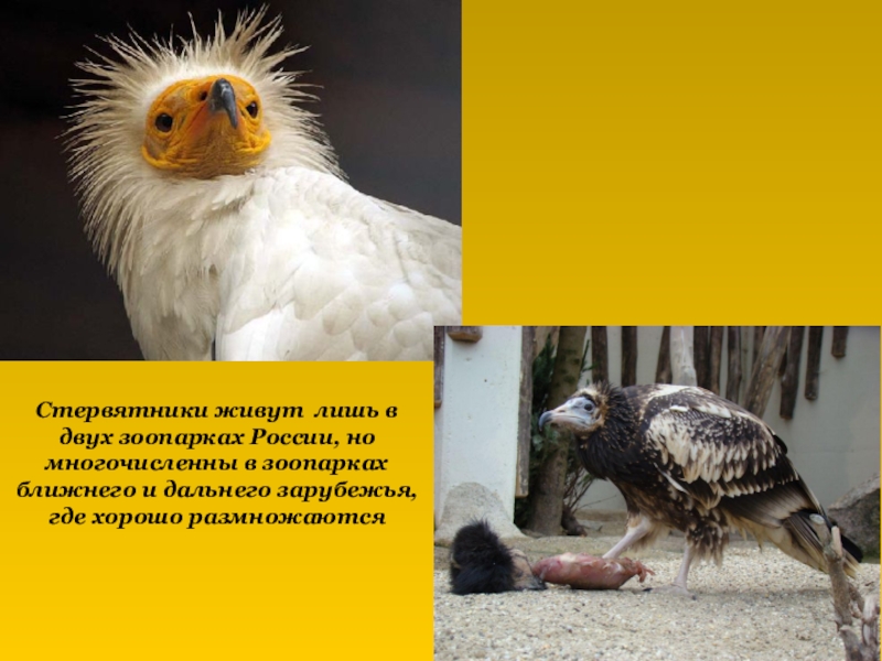 Слайд 15Стервятники живут лишь в двух зоопарках России, но многочисленны в