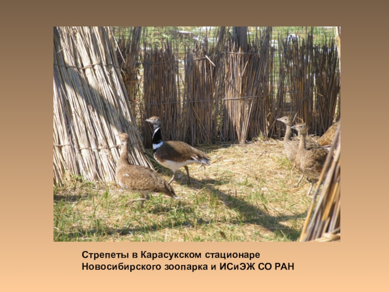 Слайд 26Стрепеты в Карасукском стационаре Новосибирского зоопарка и ИСиЭЖ СО РАН