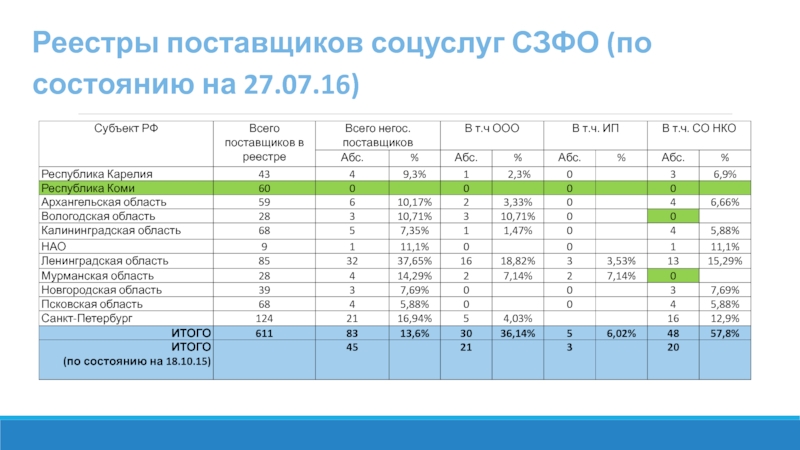 Слайд 1Реестры поставщиков соцуслуг в регионах СЗФО (по состоянию на 27.07.16)