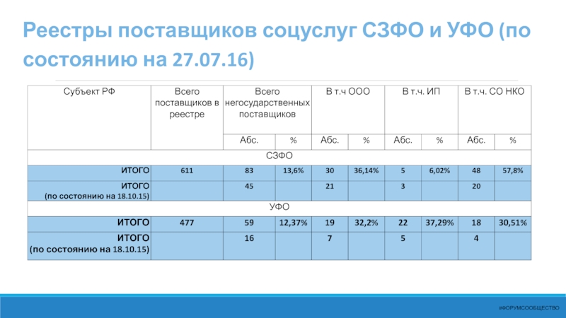 Слайд 3Реестры поставщиков соцуслуг СЗФО и УФО (по состоянию на 27.07.16)