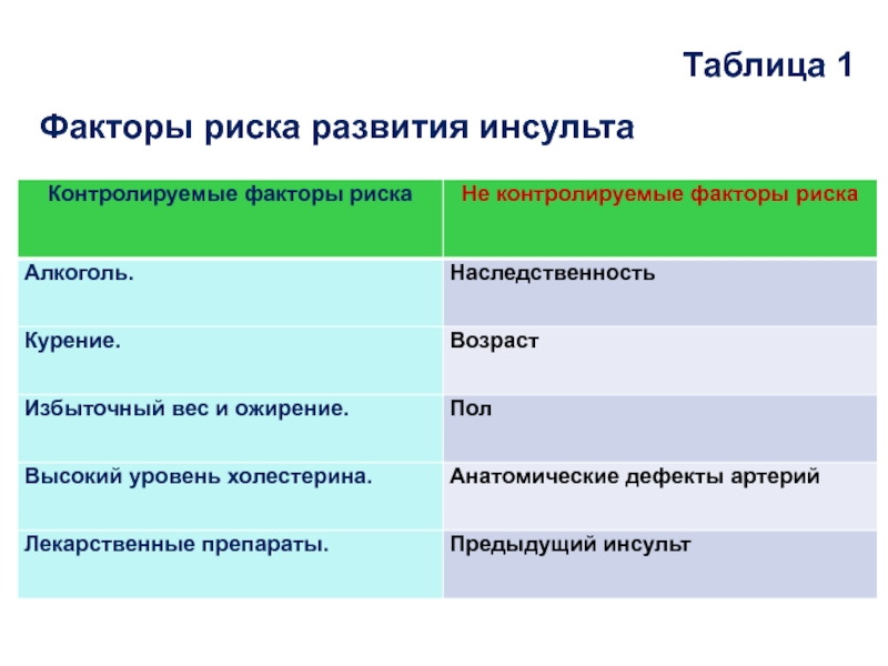 4. Факторы риска развития инсульта контролируемые (вредные привычки, избыточный вес, некоторые лекарственные препараты) и не контролируемые (наследственность, возраст, пол, анатомия артерий, инсульты в прошлом).